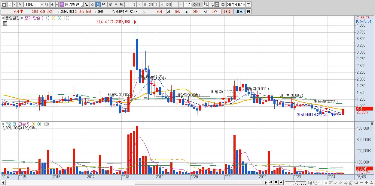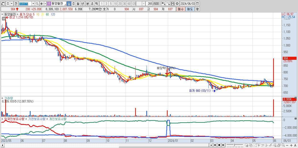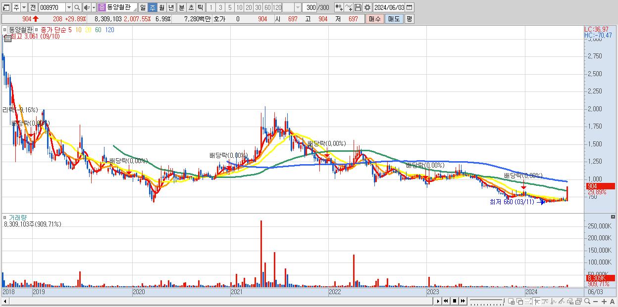 - 동양철관 (904원 , 시총: 1,075억, 거래량: 8,309,103, 거래대금:73억)