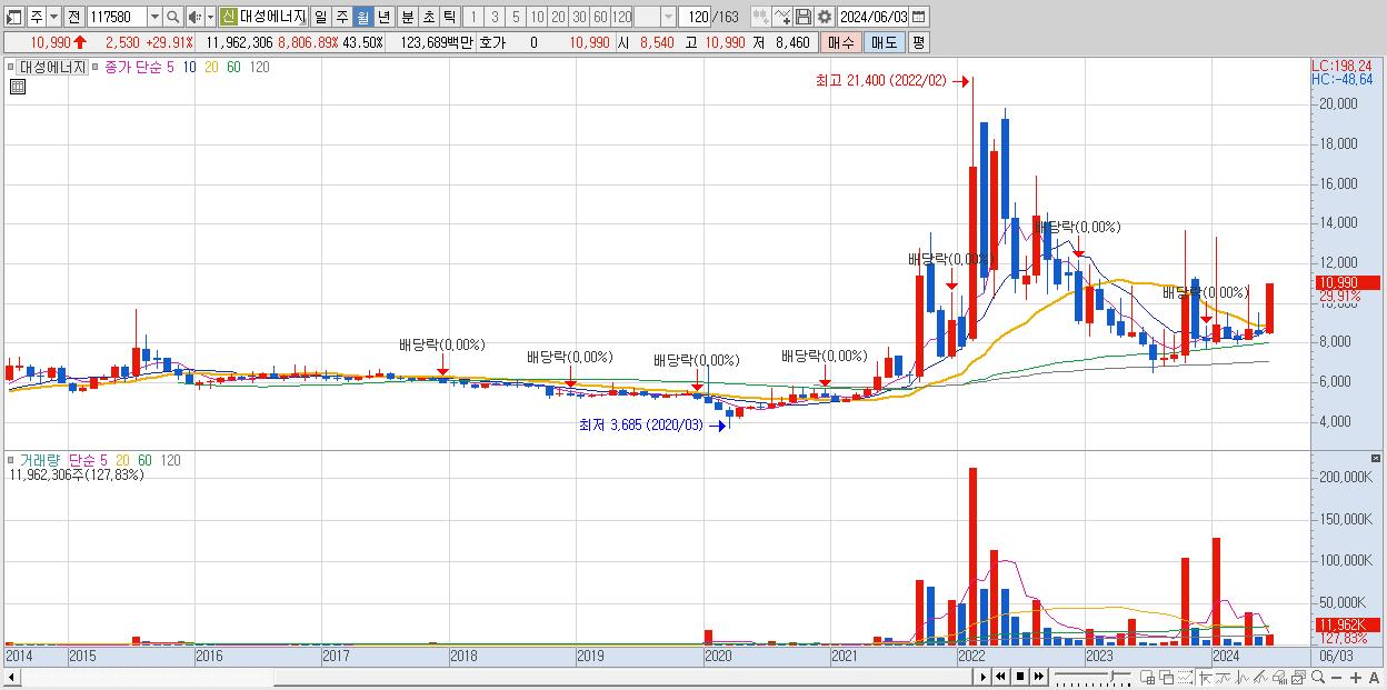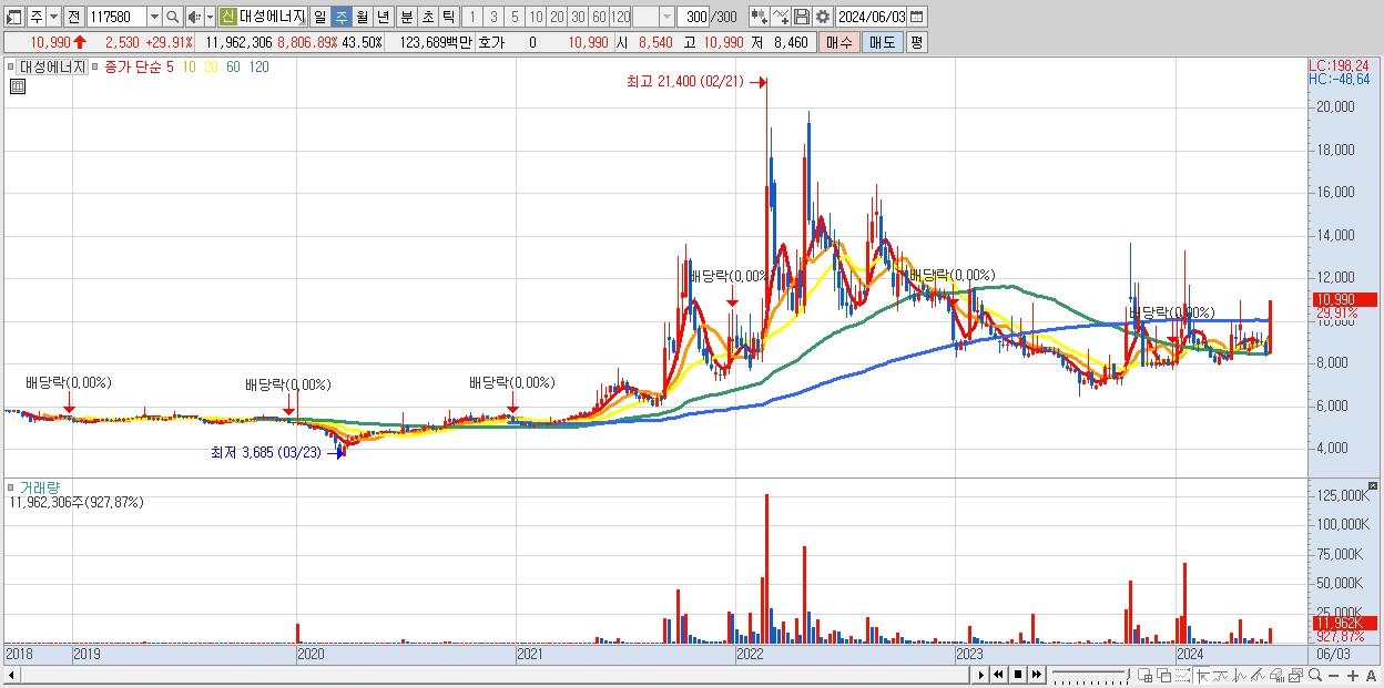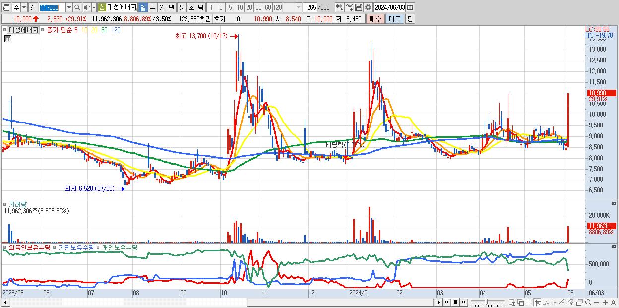 - 대성에너지 (10,990원 , 시총: 3,022억, 거래량: 11,962,306, 거래대금:1,237억)