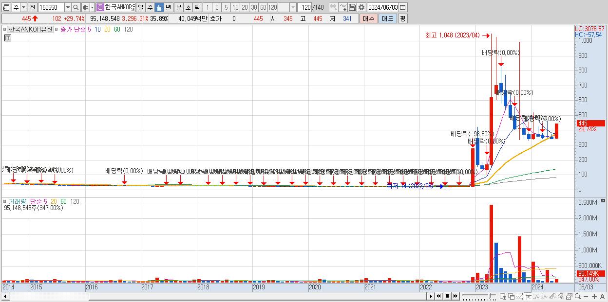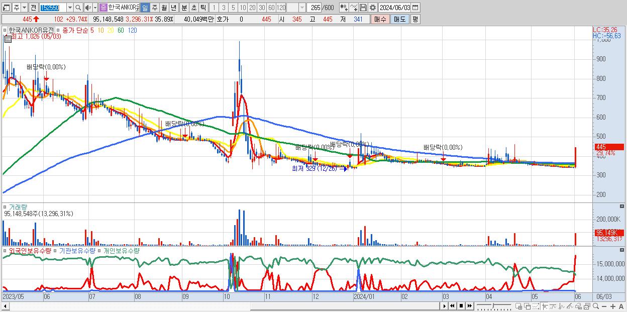 - 한국ANKOR유전 (445원 , 시총: 312억, 거래량: 95,148,548, 거래대금:400억)