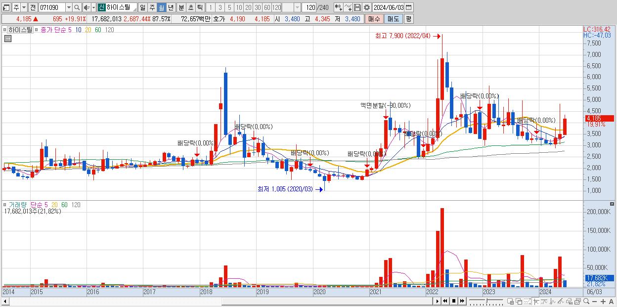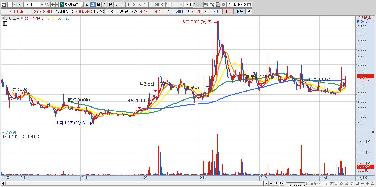 - 하이스틸 (4,185원 , 시총: 845억, 거래량: 17,682,013, 거래대금:727억)