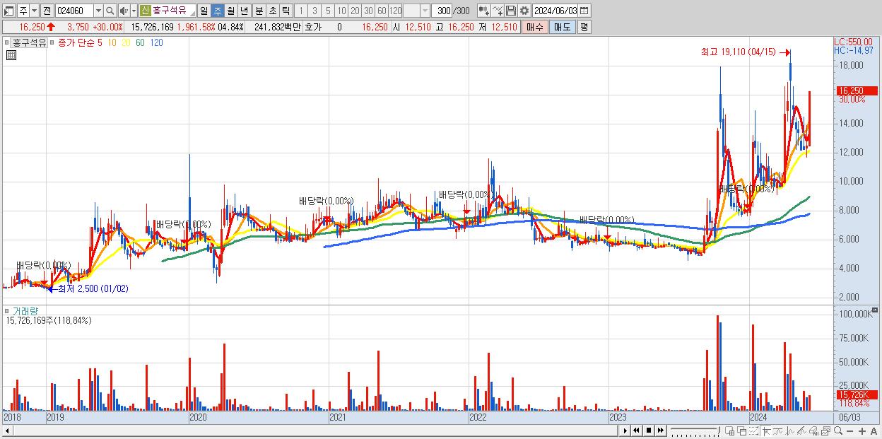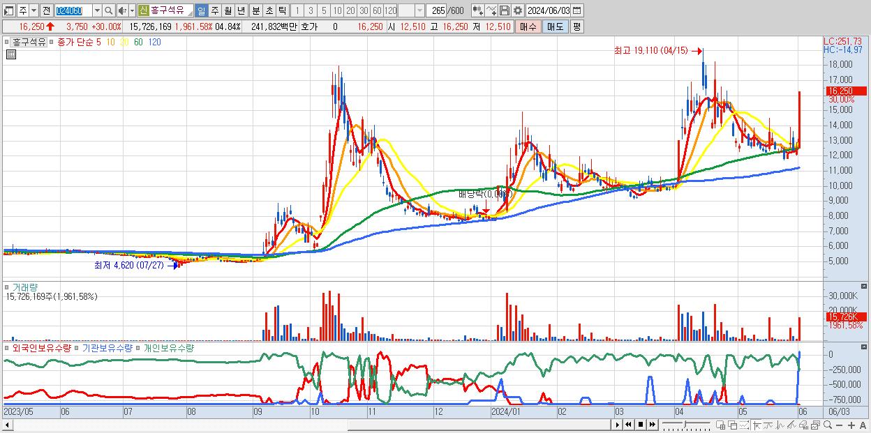 - 흥구석유 (16,250원 , 시총: 2,438억, 거래량: 15,726,169, 거래대금:2,418억)