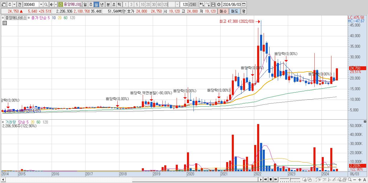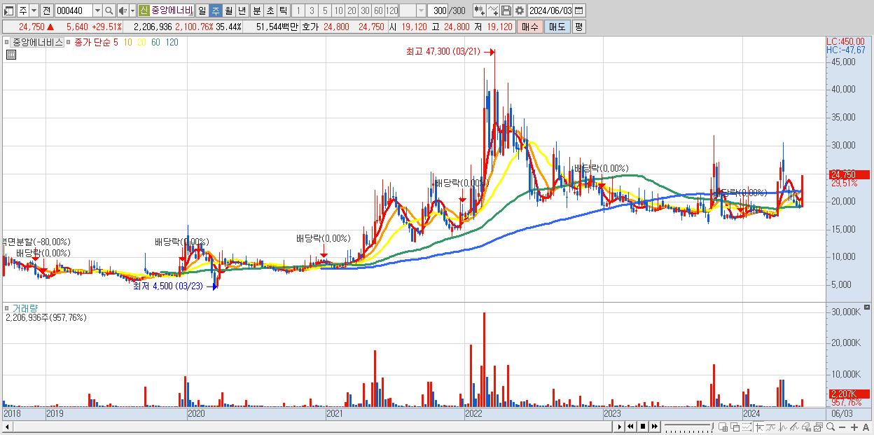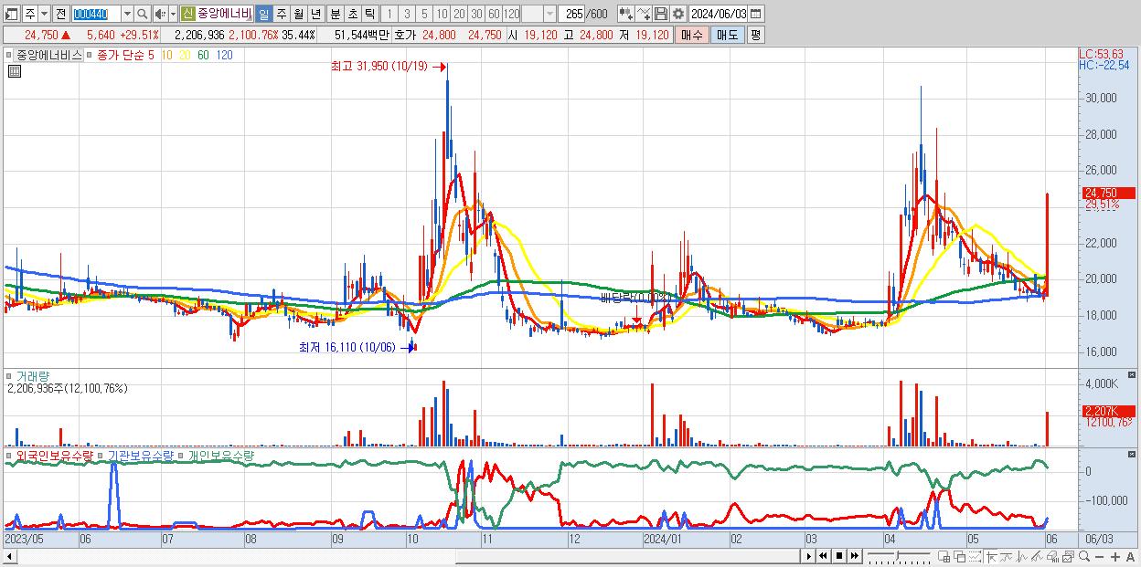 - 중앙에너비스 (24,750원 , 시총: 1,541억, 거래량: 2,206,936, 거래대금:515억)