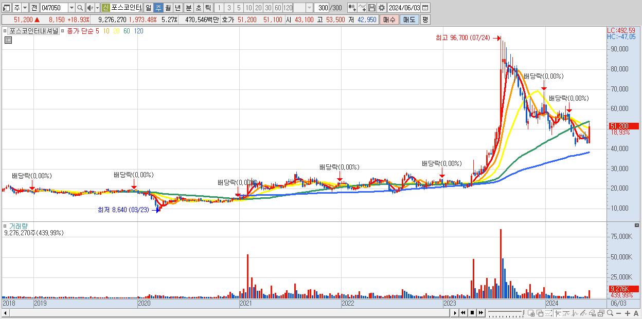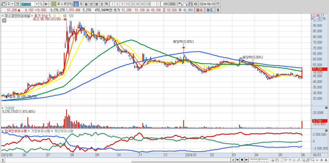- 포스코인터내셔널 (51,200원 , 시총: 90,072억, 거래량: 9,276,270, 거래대금:4,705억)