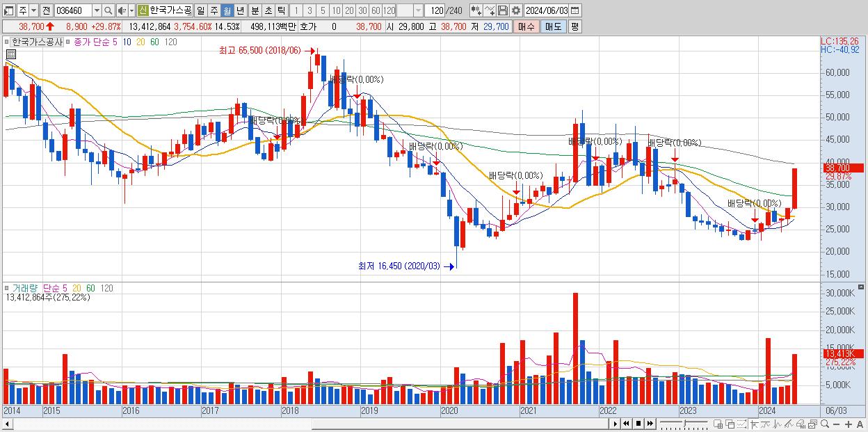 - 한국가스공사 (38,700원 , 시총: 35,725억, 거래량: 13,412,864, 거래대금:4,981억)