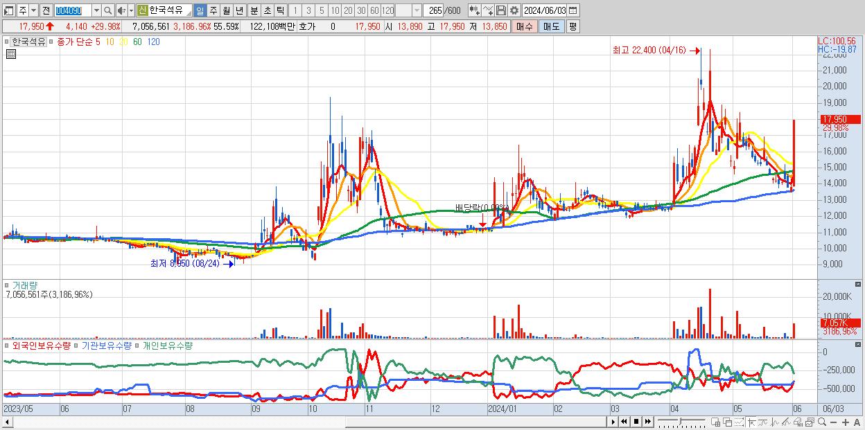 - 한국석유 (17,950원 , 시총: 2,279억, 거래량: 7,056,561, 거래대금:1,221억)