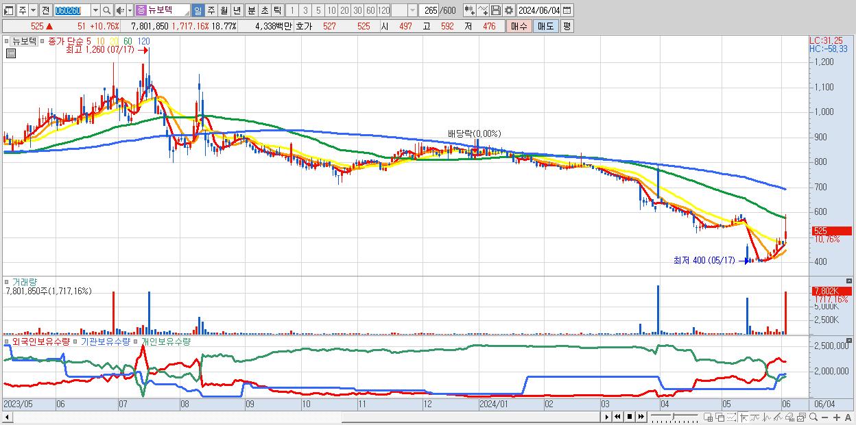 - 뉴보텍 (525원 ▲ 10.76% , 시총: 218억, 거래량: 7,801,850, 거래대금:43억)