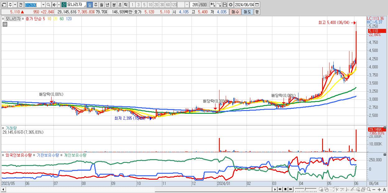 - 모나리자 (5,110원 ▲ 22.84% , 시총: 1,869억, 거래량: 29,145,616, 거래대금:1,469억)