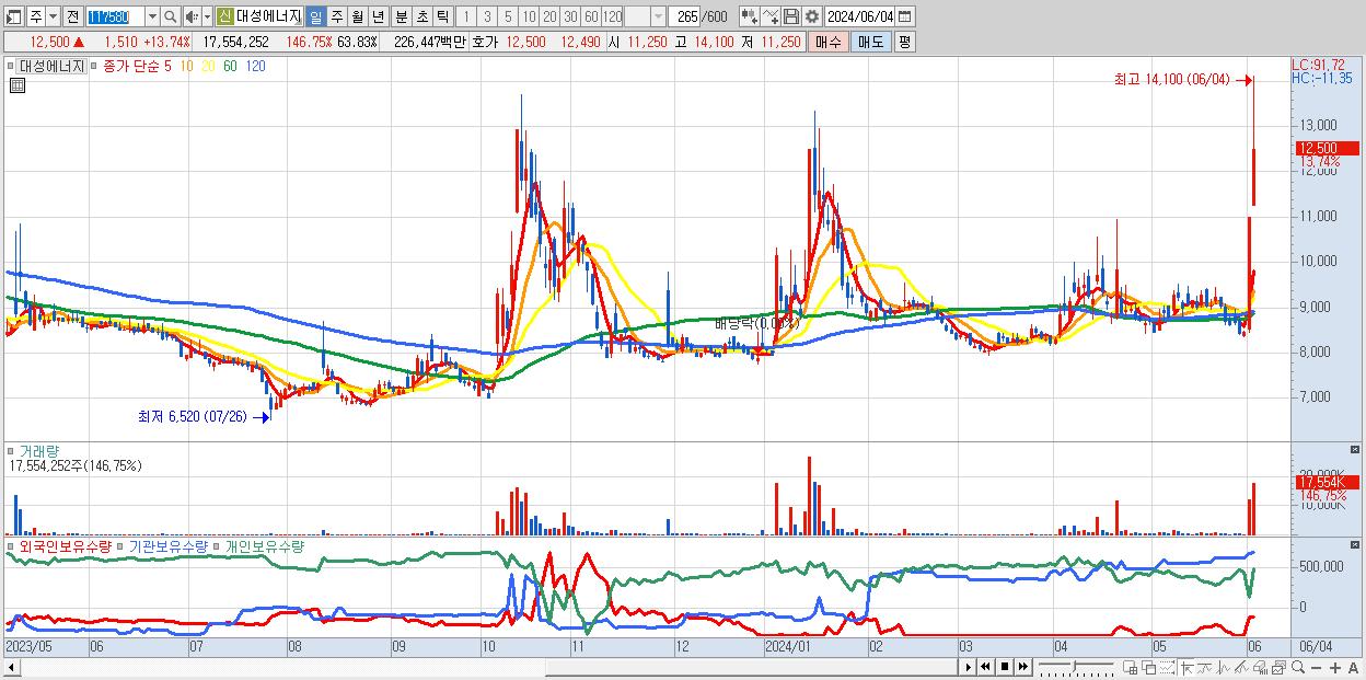 - 대성에너지 (12,500원 ▲ 13.74% , 시총: 3,438억, 거래량: 17,554,252, 거래대금:2,264억)