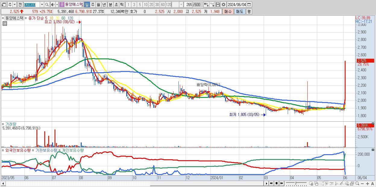 - 동양에스텍 (2,525원 ▲ 29.75% , 시총: 497억, 거래량: 5,391,468, 거래대금:123억)