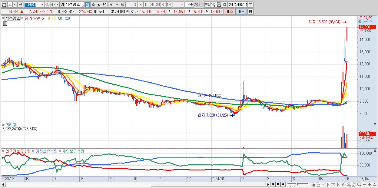 - 삼성공조 (14,990원 ▲ 22.17% , 시총: 1,218억, 거래량: 8,983,842, 거래대금:1,315억)