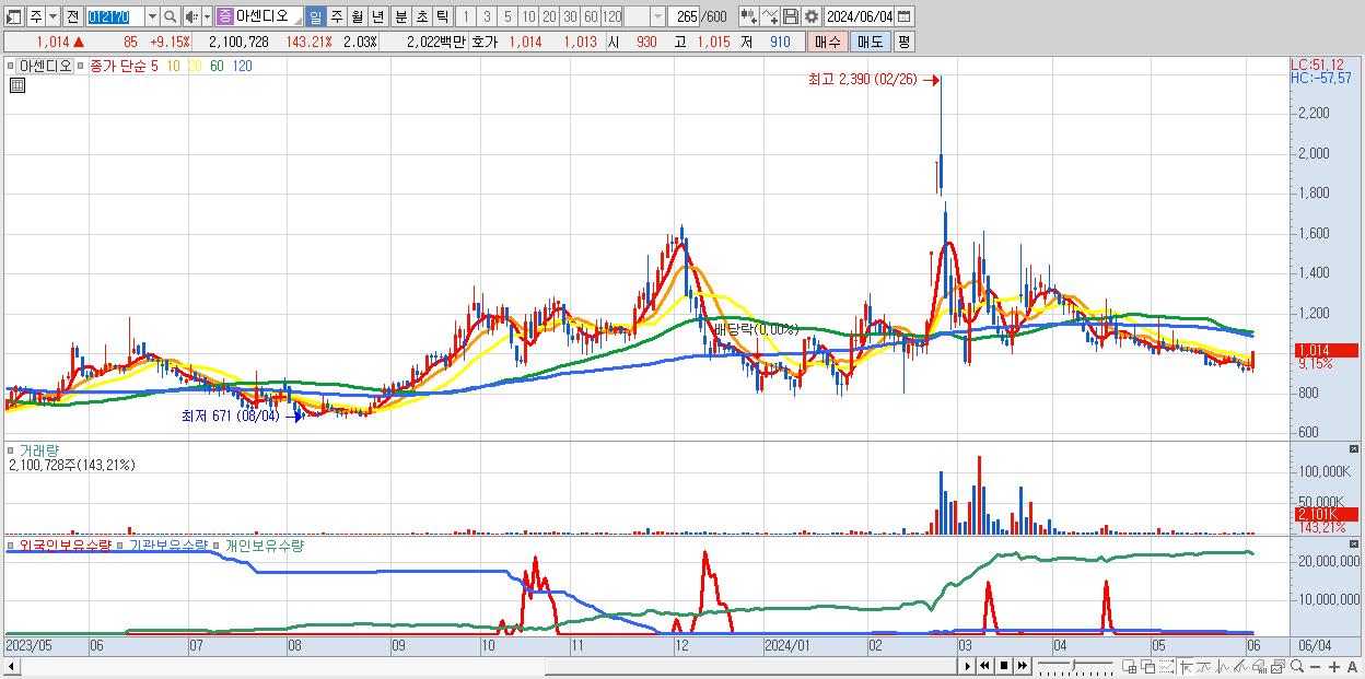 - 아센디오 (1,014원 ▲ 9.15% , 시총: 1,050억, 거래량: 2,100,728, 거래대금:20억)