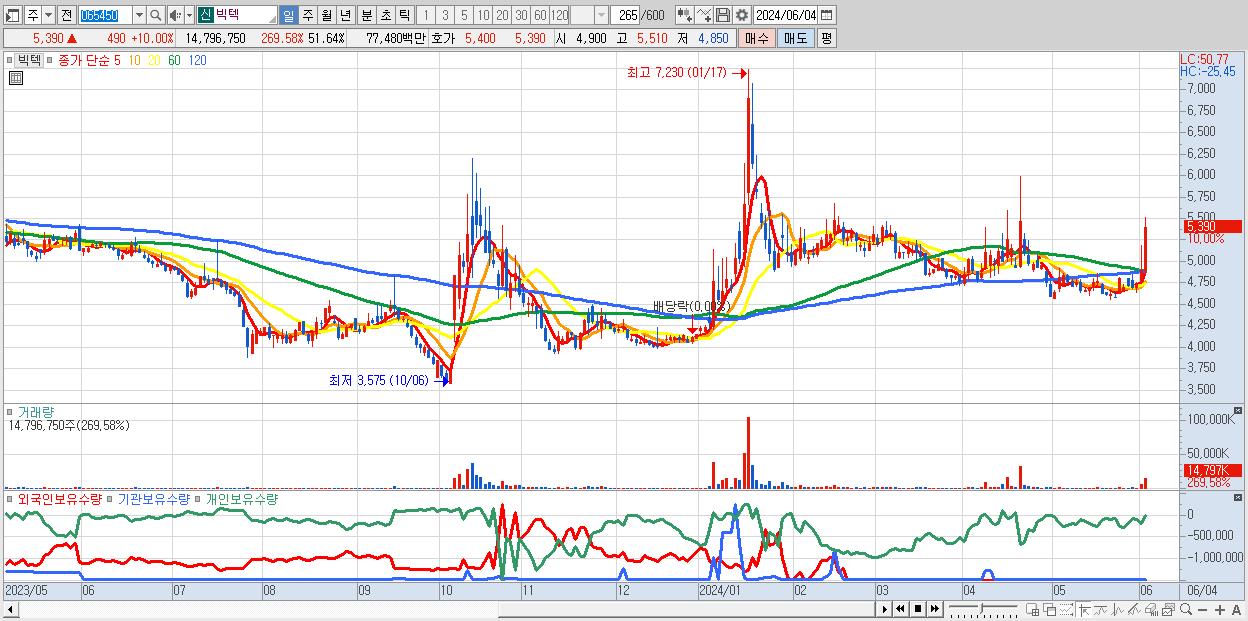 - 빅텍 (5,390원 ▲ 10% , 시총: 1,544억, 거래량: 14,796,750, 거래대금:775억)