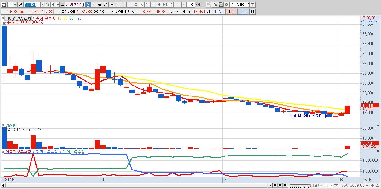 - 케이엔알시스템 (16,860원 ▲ 12.93% , 시총: 1,832억, 거래량: 2,872,820, 거래대금:496억)