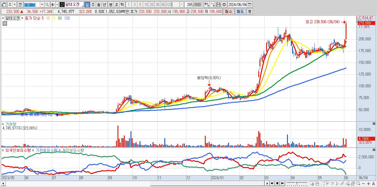 - 알테오젠 (233,500원 ▲ 17.34% , 시총: 124,102억, 거래량: 4,745,977, 거래대금:10,526억)