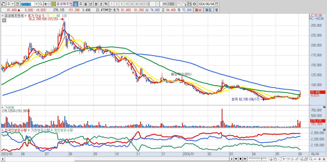 - 윤성에프앤씨 (81,400원 ▲ 8.82% , 시총: 6,495억, 거래량: 278,125, 거래대금:225억)