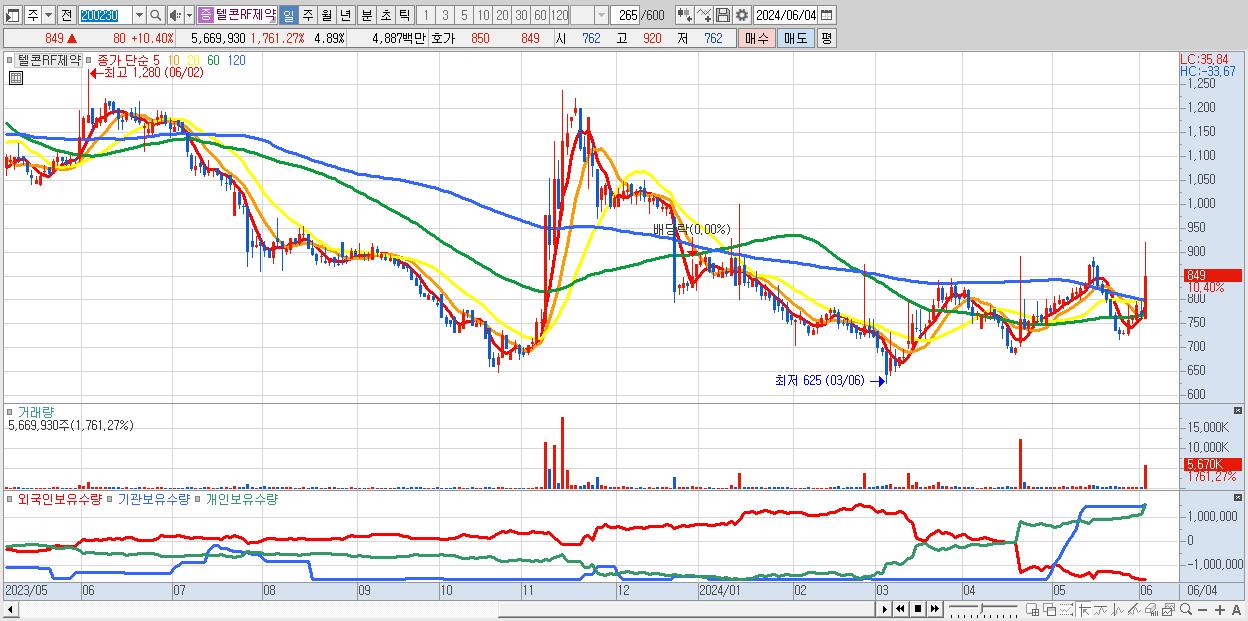 - 텔콘RF제약 (849원 ▲ 10.4% , 시총: 985억, 거래량: 5,669,930, 거래대금:49억)