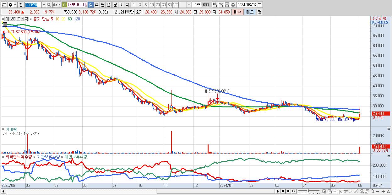 - 대보마그네틱 (26,400원 ▲ 9.77% , 시총: 2,074억, 거래량: 760,938, 거래대금:212억)