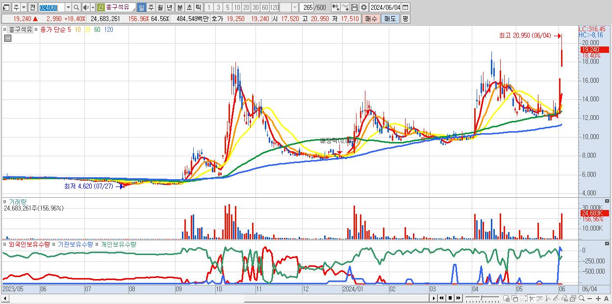 - 흥구석유 (19,240원 ▲ 18.4% , 시총: 2,886억, 거래량: 24,683,261, 거래대금:4,845억)
