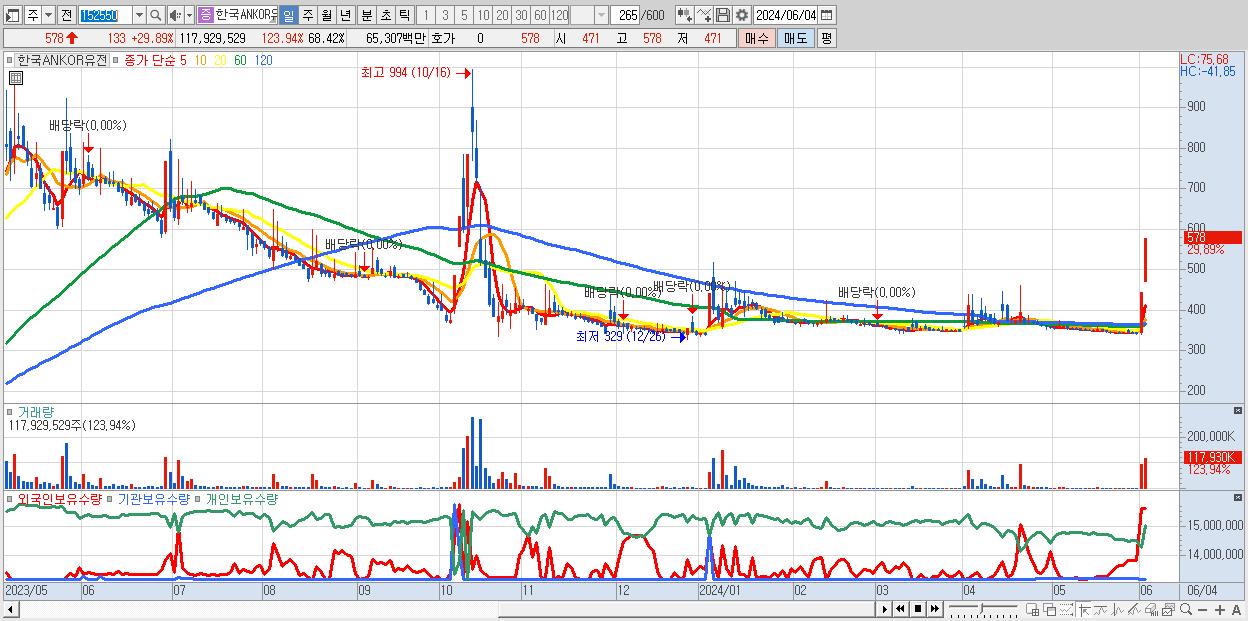 - 한국ANKOR유전 (578원 ▲ 29.89% , 시총: 405억, 거래량: 117,929,529, 거래대금:653억)