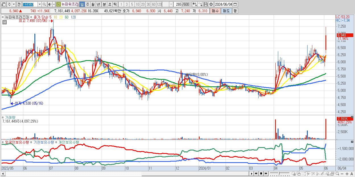 - 뉴파워프라즈마 (6,940원 ▲ 11.94% , 시총: 3,032억, 거래량: 7,161,449, 거래대금:496억)