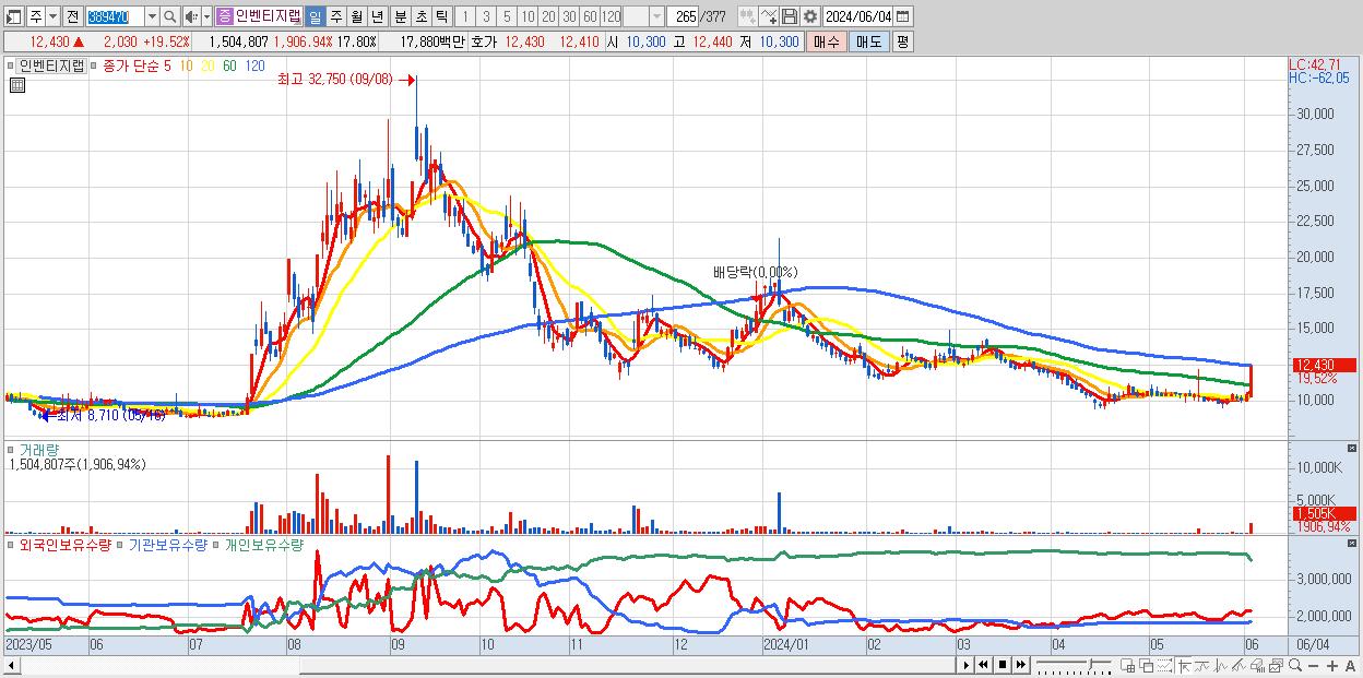 - 인벤티지랩 (12,430원 ▲ 19.52% , 시총: 1,051억, 거래량: 1,504,807, 거래대금:179억)