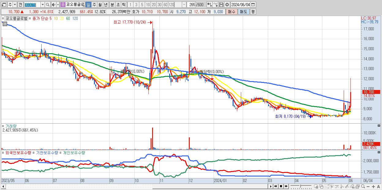 - 코오롱글로벌 (10,700원 ▲ 14.81% , 시총: 2,026억, 거래량: 2,427,909, 거래대금:264억)
