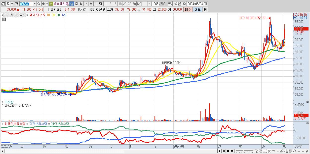 - 솔브레인홀딩스 (79,000원 ▲ 17.04% , 시총: 16,562억, 거래량: 1,357,296, 거래대금:1,057억)