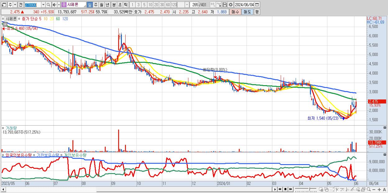 - 샤페론 (2,475원 ▲ 15.93% , 시총: 571억, 거래량: 13,793,687, 거래대금:335억)