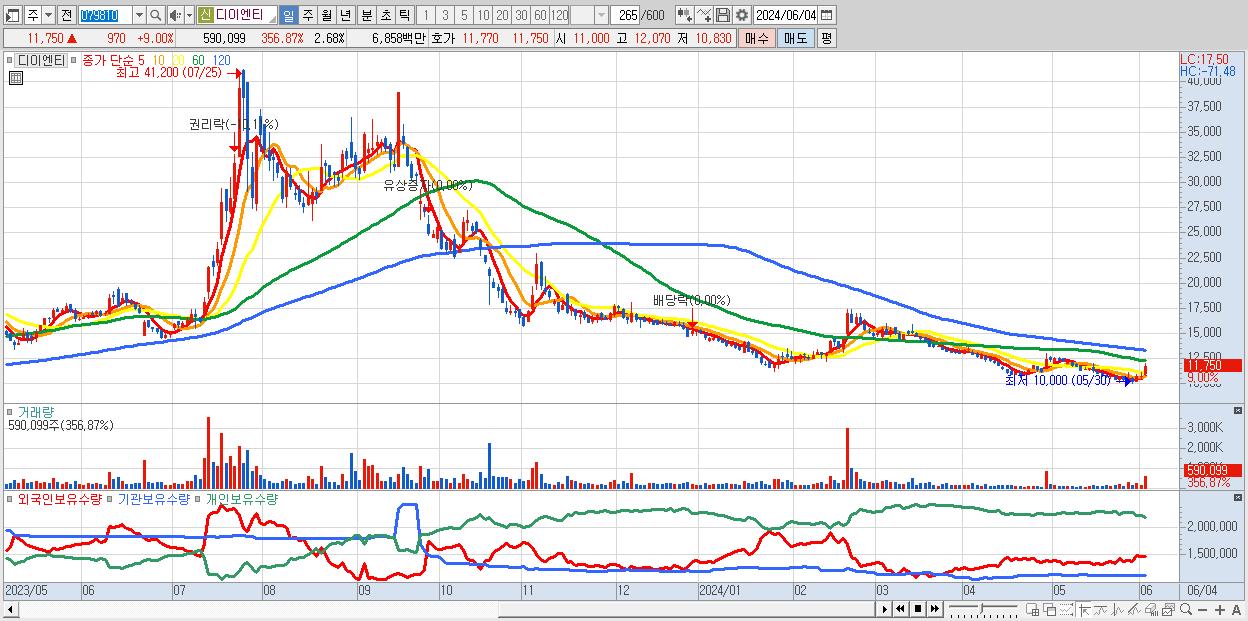 - 디이엔티 (11,750원 ▲ 9% , 시총: 2,588억, 거래량: 590,099, 거래대금:69억)