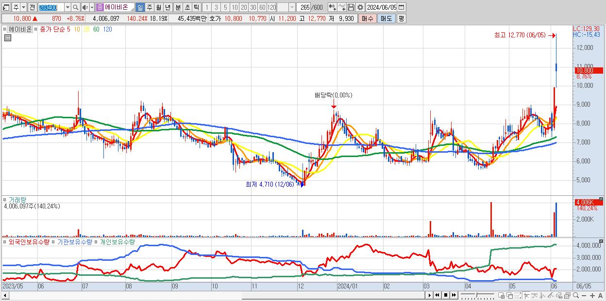 - 에이비온 (10,800원 ▲ 8.76% , 시총: 2,379억, 거래량: 4,006,097, 거래대금:454억, KOSDAQ)
