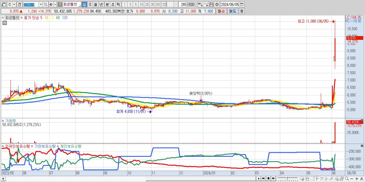 - 화성밸브 (9,870원 ▲ 14.37% , 시총: 1,028억, 거래량: 50,432,685, 거래대금:4,833억, KOSDAQ)