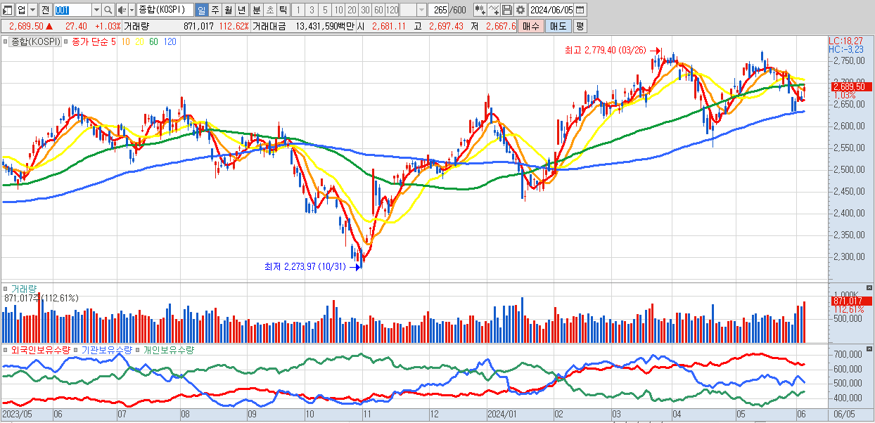 | 06/05 | 2,689.50 | ▲1.03% | -3,306억 | 5,901억 | -2,596억 | 1억 |