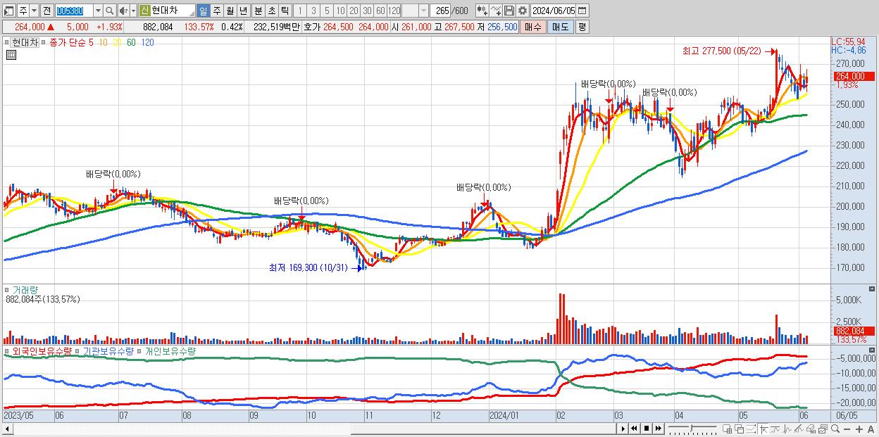 - 현대차 (264,000원 ▲ 1.93% , 시총: 552,859억, 거래량: 882,084, 거래대금:2,325억)