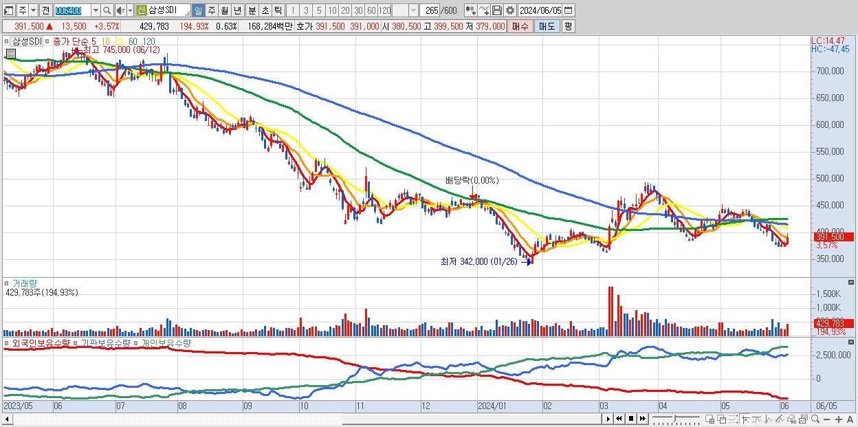 - 삼성SDI (391,500원 ▲ 3.57% , 시총: 269,213억, 거래량: 429,783, 거래대금:1,683억)