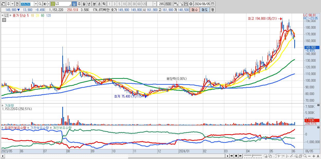 - LS (149,900원 ▼ -8.49% , 시총: 48,268억, 거래량: 1,153,220, 거래대금:1,749억)