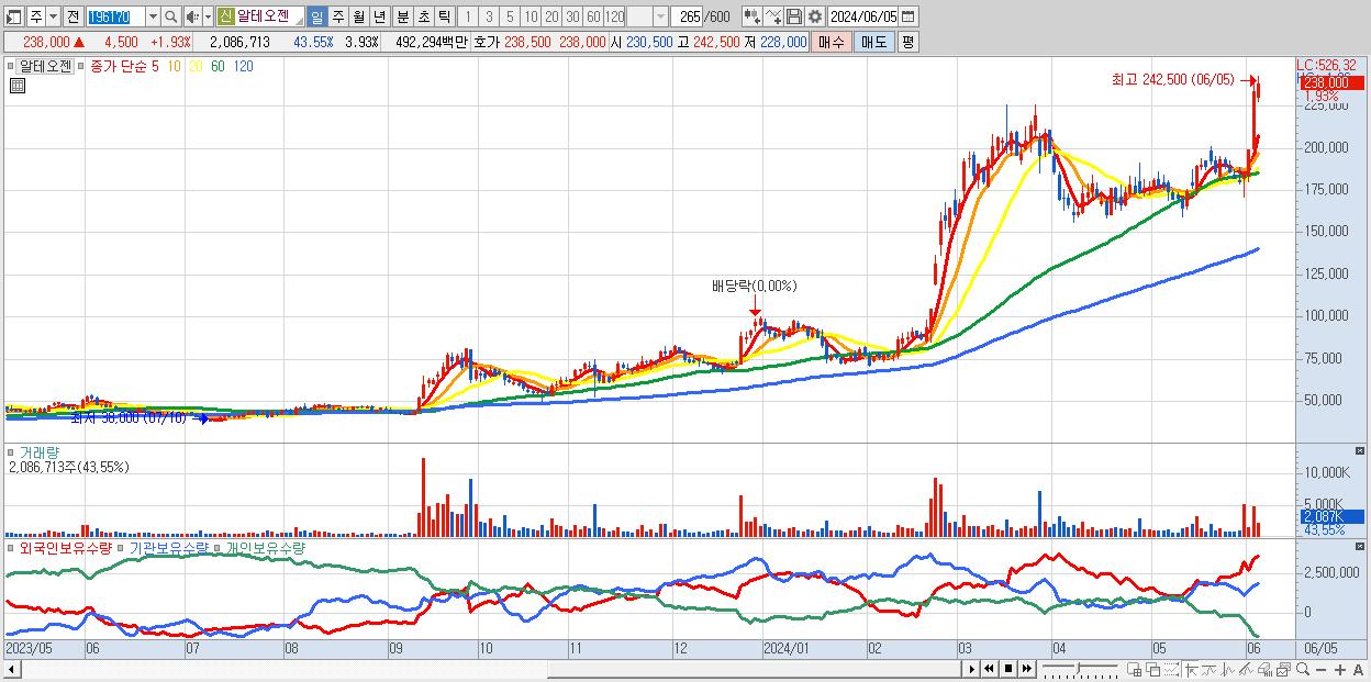 - 알테오젠 (238,000원 ▲ 1.93% , 시총: 126,493억, 거래량: 2,086,713, 거래대금:4,923억)