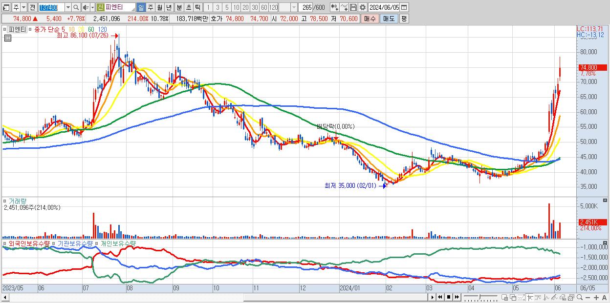 - 피엔티 (74,800원 ▲ 7.78% , 시총: 17,010억, 거래량: 2,451,096, 거래대금:1,837억)