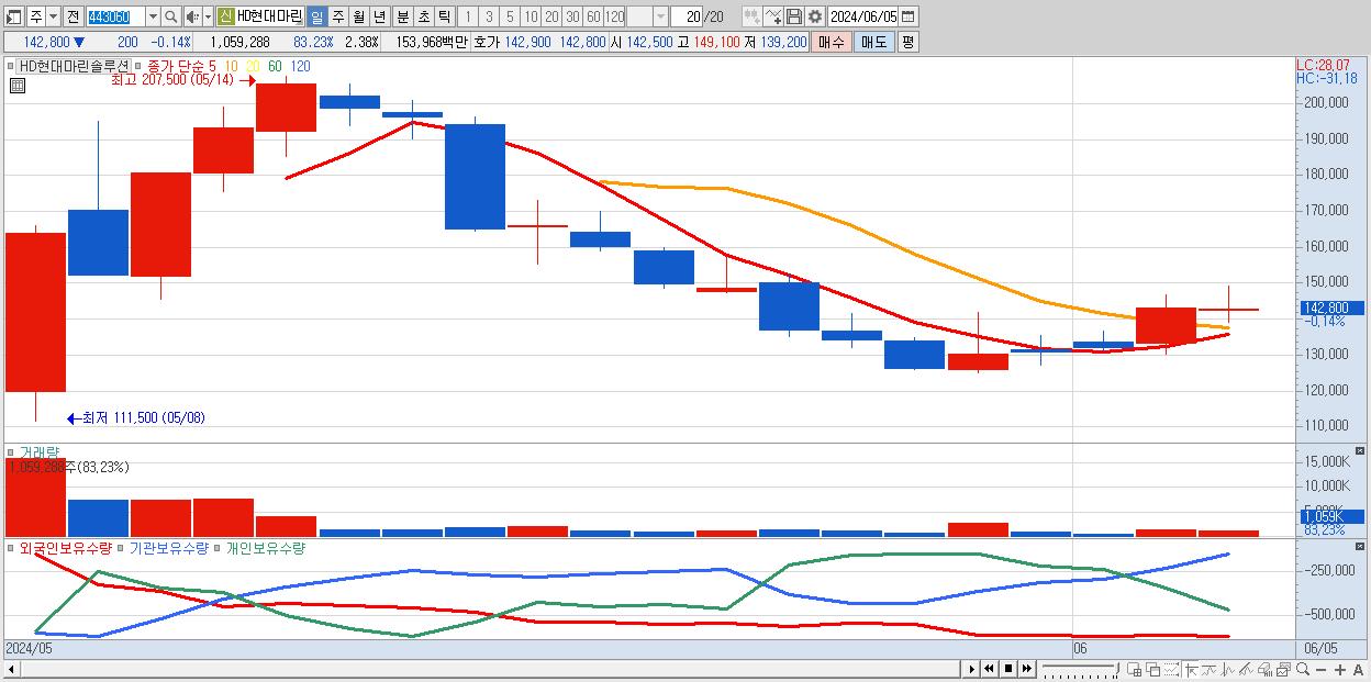 - HD현대마린솔루션 (142,800원 ▼ -0.14% , 시총: 63,475억, 거래량: 1,059,288, 거래대금:1,540억)