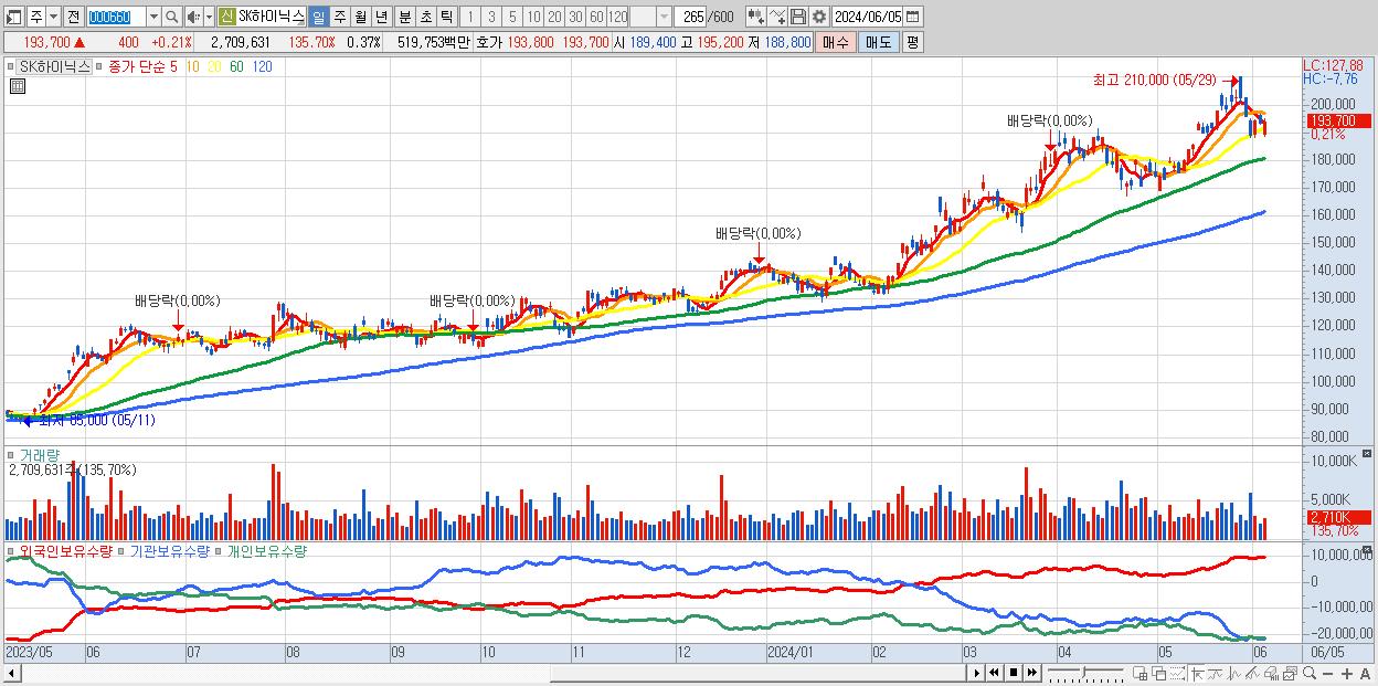 - SK하이닉스 (193,700원 ▲ 0.21% , 시총: 1,410,141억, 거래량: 2,709,631, 거래대금:5,198억)