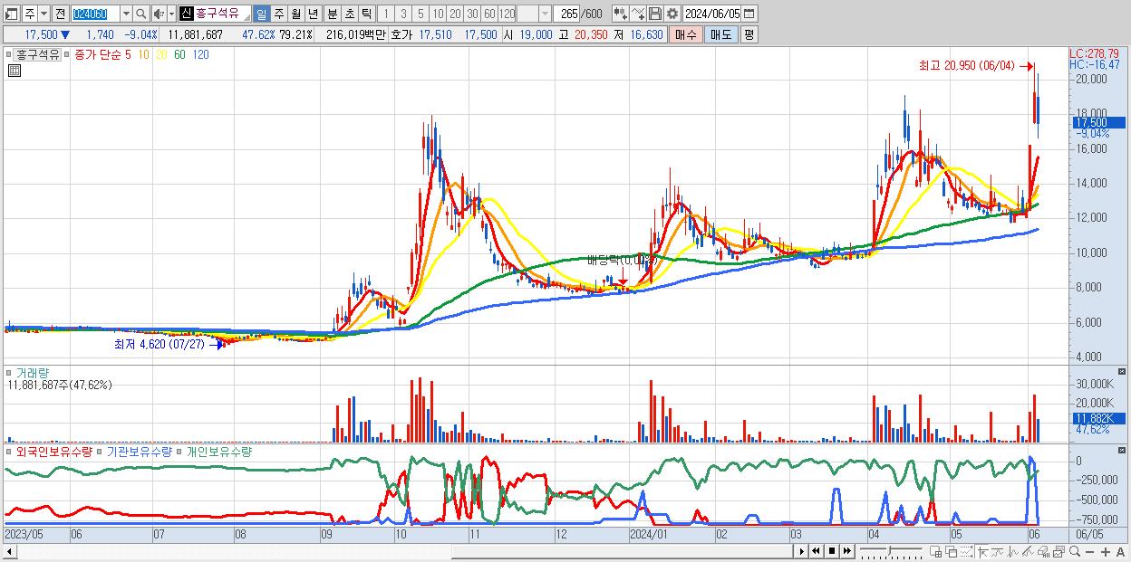 - 흥구석유 (17,500원 ▼ -9.04% , 시총: 2,625억, 거래량: 11,881,687, 거래대금:2,160억)