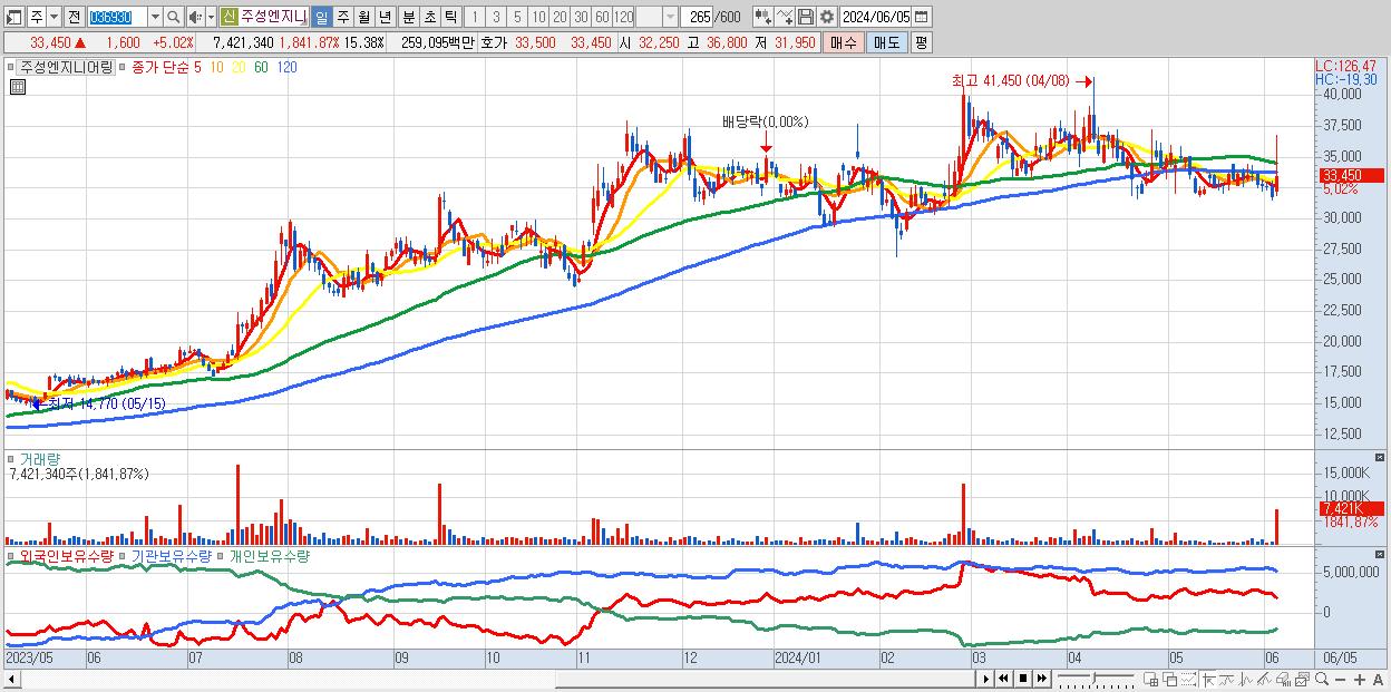 - 주성엔지니어링 (33,450원 ▲ 5.02% , 시총: 16,139억, 거래량: 7,421,340, 거래대금:2,591억)