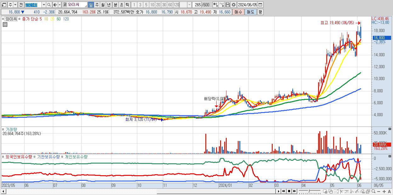 - 와이씨 (16,800원 ▼ -2.38% , 시총: 13,784억, 거래량: 20,664,764, 거래대금:3,726억)
