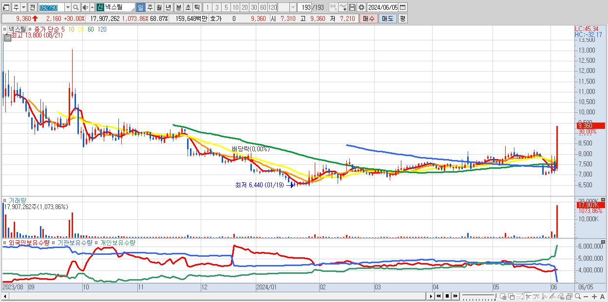 - 넥스틸 (9,360원 ▲ 30% , 시총: 2,434억, 거래량: 17,907,262, 거래대금:1,596억)