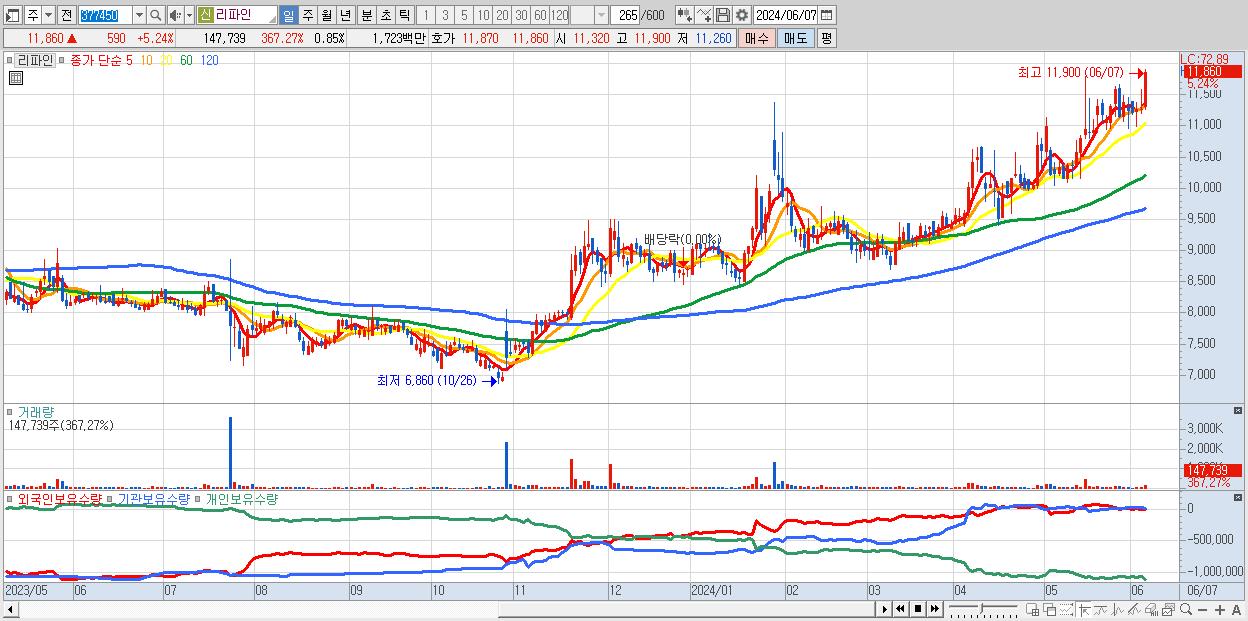 - 리파인 (11,860원 ▲ 5.24% , 시총: 2,055억, 거래량: 147,739, 거래대금:17억, KOSDAQ)