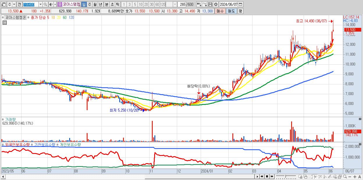 - 코아스템켐온 (13,500원 ▲ 1.35% , 시총: 4,438억, 거래량: 629,998, 거래대금:87억, KOSDAQ)