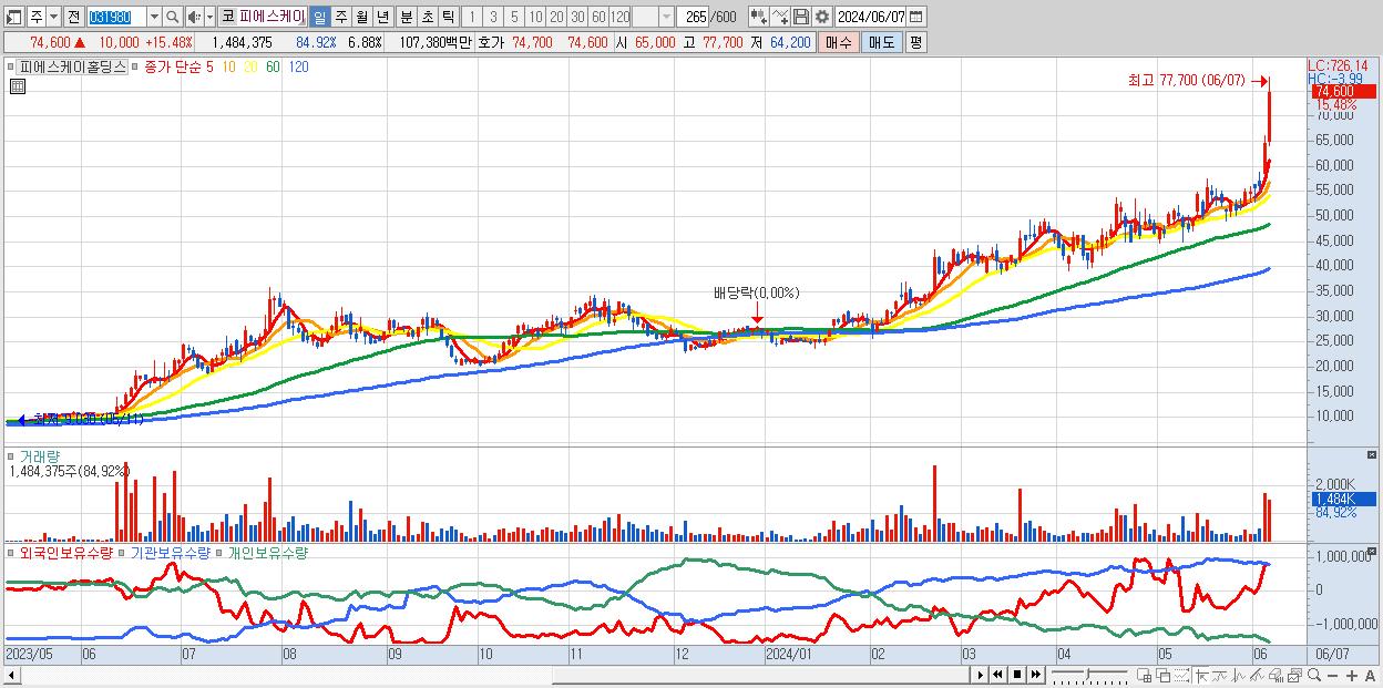 - 피에스케이홀딩스 (74,600원 ▲ 15.48% , 시총: 16,086억, 거래량: 1,484,375, 거래대금:1,074억, KOSDAQ)