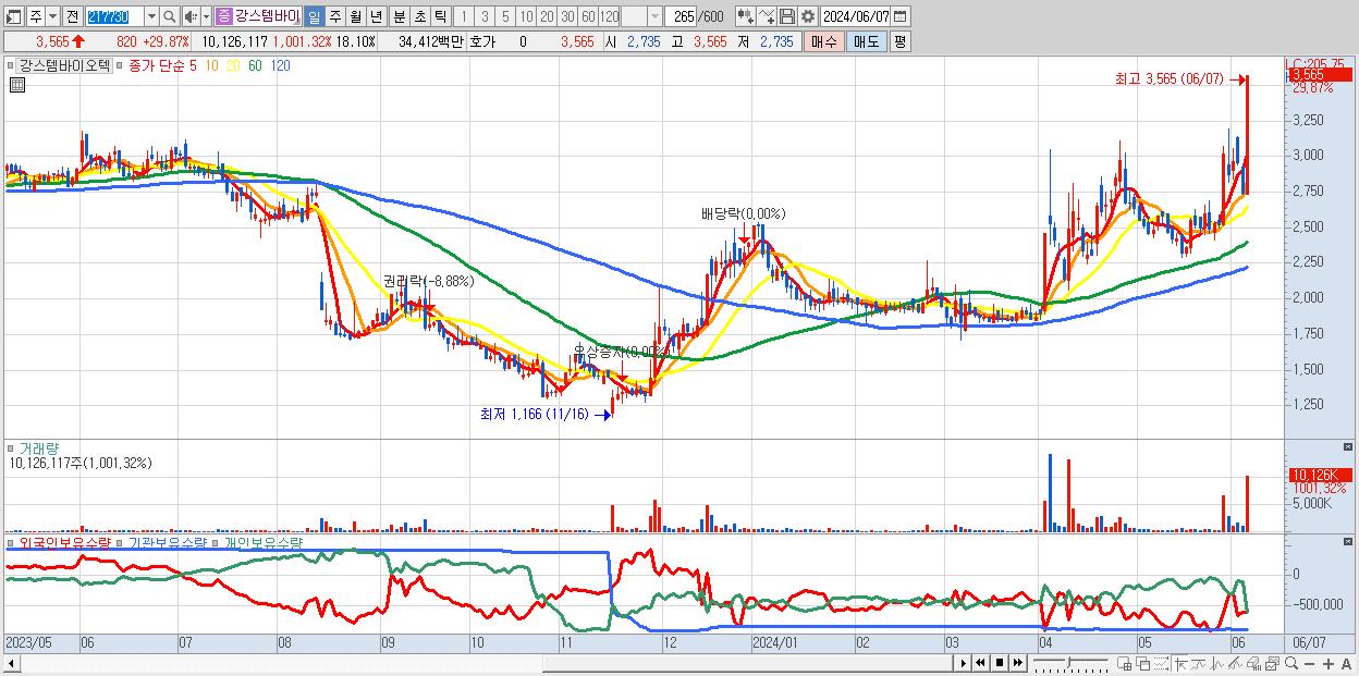 - 강스템바이오텍 (3,565원 ▲ 29.87% , 시총: 1,994억, 거래량: 10,126,117, 거래대금:344억, KOSDAQ)