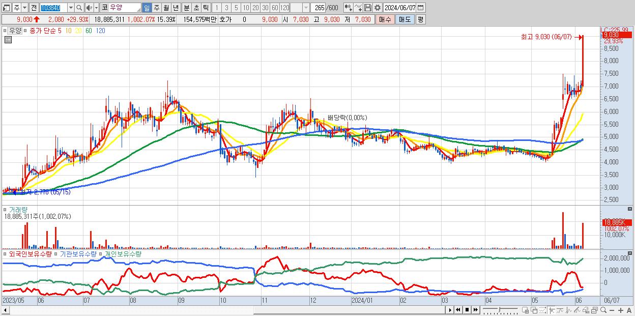 - 우양 (9,030원 ▲ 29.93% , 시총: 1,478억, 거래량: 18,885,311, 거래대금:1,546억, KOSDAQ)
