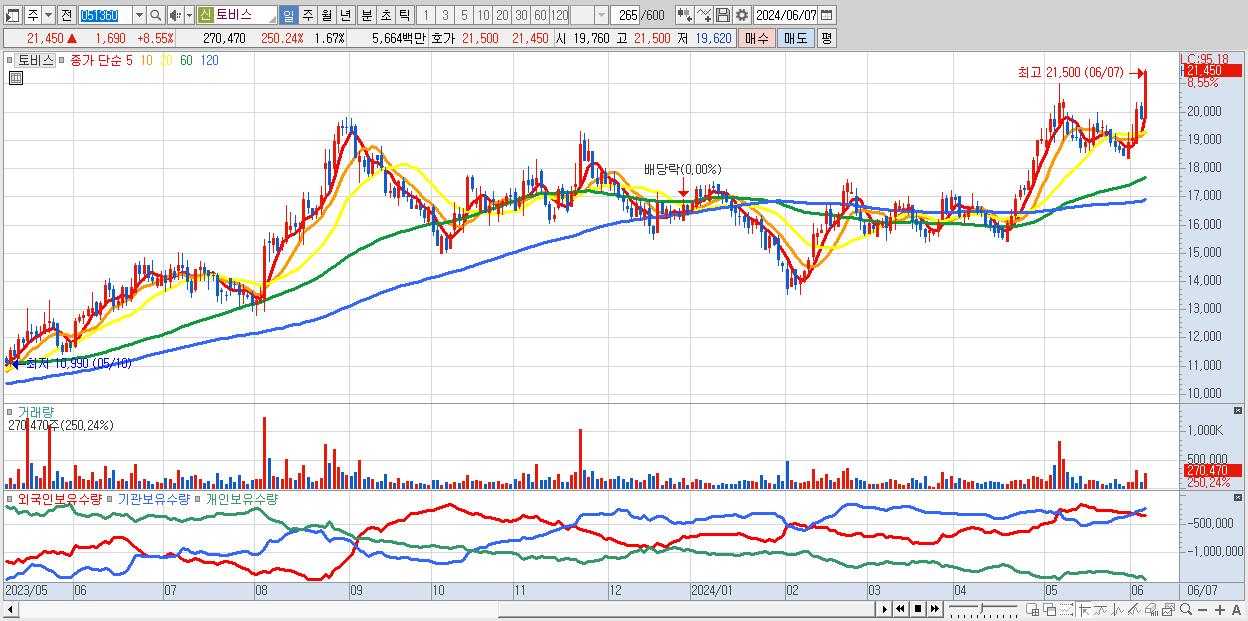 - 토비스 (21,450원 ▲ 8.55% , 시총: 3,468억, 거래량: 270,470, 거래대금:57억, KOSDAQ)