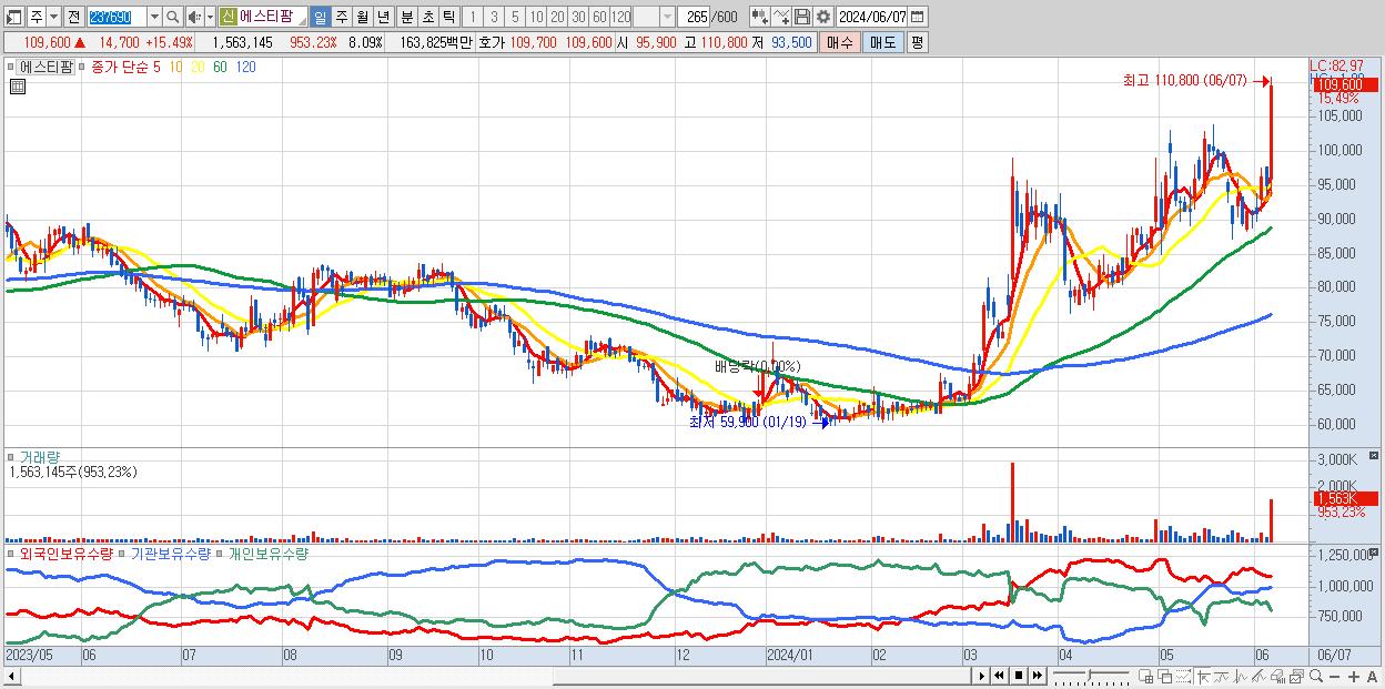- 에스티팜 (109,600원 ▲ 15.49% , 시총: 21,173억, 거래량: 1,563,145, 거래대금:1,638억, KOSDAQ)